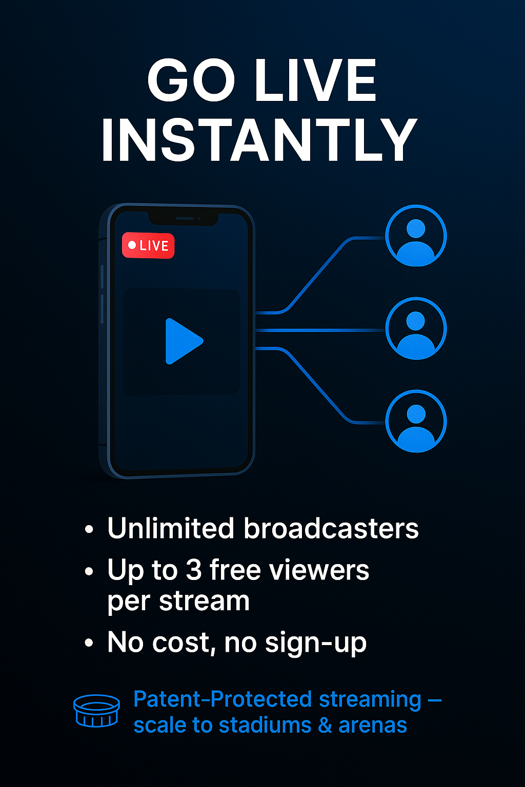 Discover the future of live broadcasting with our patent-protected technology. Each platform offers unlimited broadcasters, stadium-scale capabilities, and zero-cost live streaming solutions that revolutionize how content is shared and viewed.